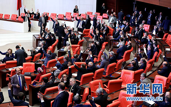4月18日,在土耳其安卡拉,土耳其大國民議會(huì)就延長緊急狀態(tài)進(jìn)行投票。新華社發(fā)