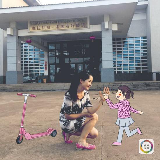 2017年,30歲的護(hù)士張曉在非洲塞拉利昂中塞友好醫(yī)院門(mén)前和自己女兒的畫(huà)像“合影”。