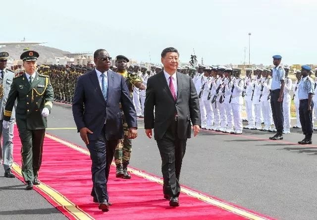 塞內(nèi)加爾總統(tǒng)薩勒在機場為習(xí)近平主席舉行隆重歡迎儀式。(新華社記者謝環(huán)馳攝)