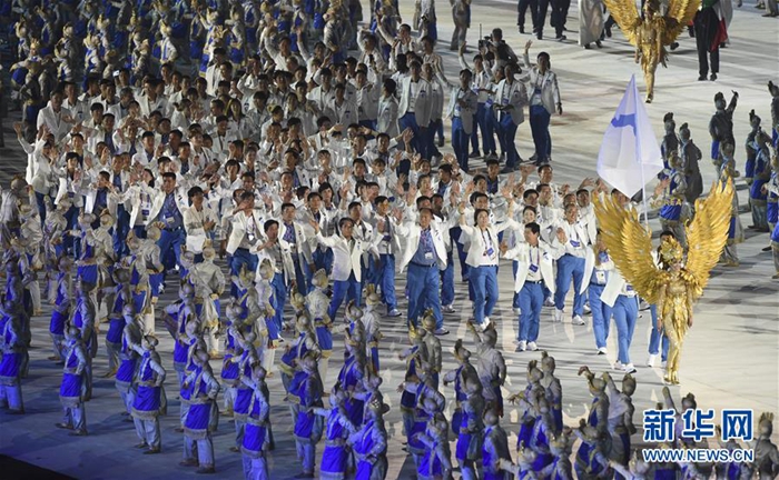 8月18日,第18屆亞運(yùn)會(huì)開幕式在印度尼西亞雅加達(dá)舉行。這是朝韓兩國(guó)代表團(tuán)在開幕式上舉“朝鮮半島旗”共同入場(chǎng)(8月18日攝)。新華社記者潘昱龍攝