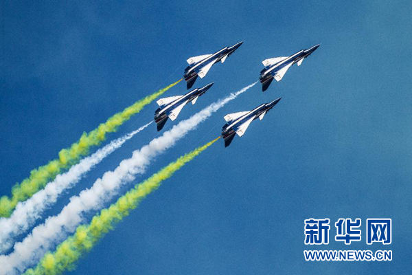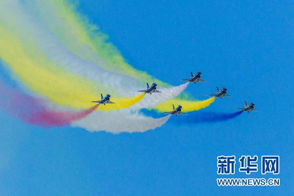 蔚藍(lán)的天空下,八一飛行表演隊(duì)成功上演了六機(jī)向下開(kāi)花、五機(jī)水平向上開(kāi)花、四機(jī)編隊(duì)橫滾、單機(jī)蛇行扭轉(zhuǎn)等21個(gè)高難度飛行動(dòng)作,贏得了現(xiàn)場(chǎng)觀眾陣陣掌聲。