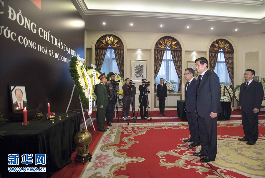 栗戰(zhàn)書敬獻(xiàn)花圈并在吊唁簿上題詞,對(duì)陳大光主席逝世表示深切哀悼。栗戰(zhàn)書表示,中方高度評(píng)價(jià)陳大光主席為發(fā)展中越兩黨兩國關(guān)系所作重要貢獻(xiàn),習(xí)近平總書記、國家主席專門向阮富仲總書記發(fā)去唁電,正在訪越的中共中央政治局常委、中央紀(jì)委書記趙樂際出席了在河內(nèi)的悼念活動(dòng)。中越互為友好鄰邦和戰(zhàn)略伙伴,中方愿同越方一道,弘揚(yáng)傳統(tǒng)友誼、增進(jìn)政治互信、深化互利合作,推動(dòng)中越兩黨兩國關(guān)系不斷發(fā)展。