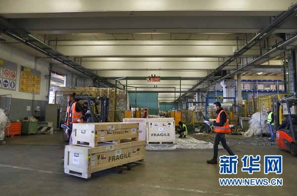 4月9日,在意大利米蘭馬爾彭薩機(jī)場(chǎng),工作人員將中國流失文物藝術(shù)品運(yùn)送上飛機(jī)。 新華社記者 程婷婷 攝