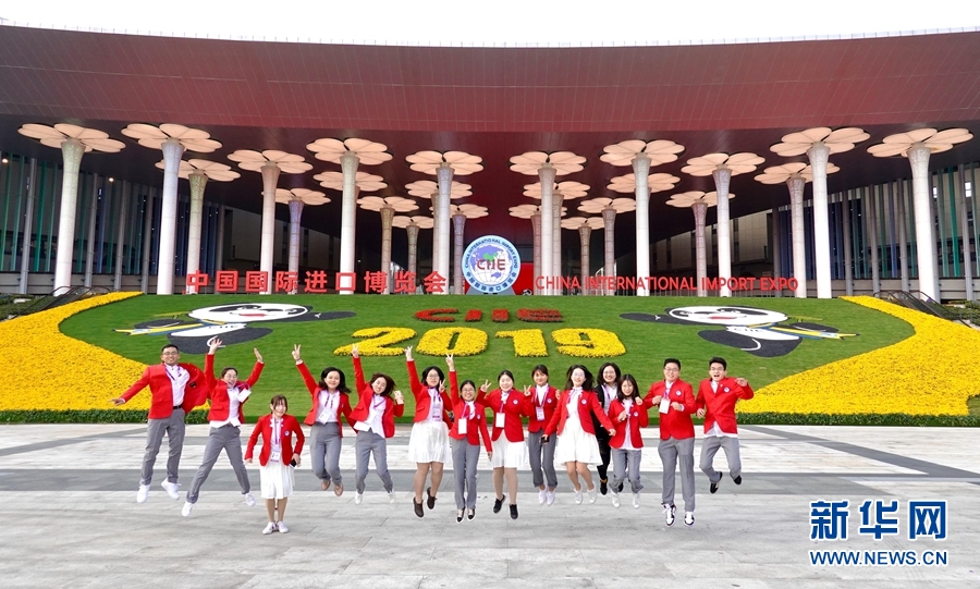 11月4日,第二屆進(jìn)博會部分志愿者在國家會展中心(上海)南廣場合影留念。 第二屆中國國際進(jìn)口博覽會將于11月5日上午在上海開幕。 新華社記者 才揚(yáng) 攝