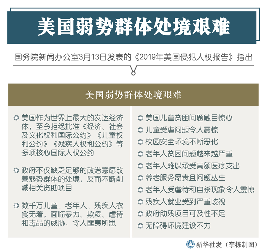 新華社北京3月13日電(記者王鵬、賈釗)國務(wù)院新聞辦13日發(fā)表的《2019年美國侵犯人權(quán)報(bào)告》指出,美國弱勢群體處境艱難。