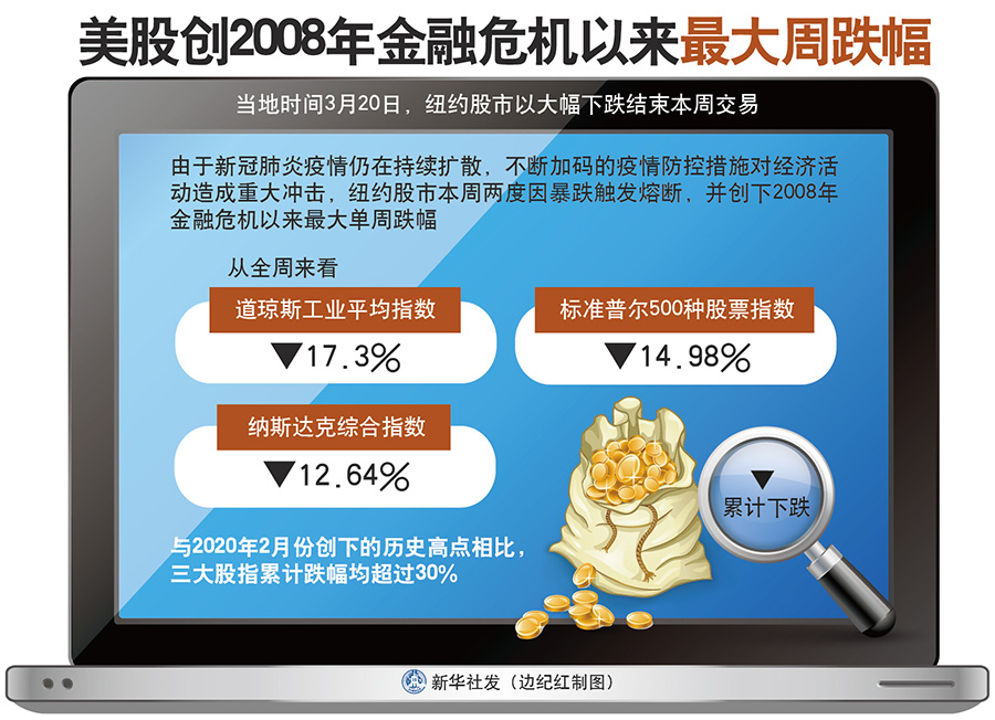 由于新冠肺炎疫情仍在持續(xù)擴散,不斷加碼的疫情防控措施對經濟活動造成重大沖擊,紐約股市本周兩度因暴跌觸發(fā)熔斷,并創(chuàng)下2008年金融危機以來最大單周跌幅。