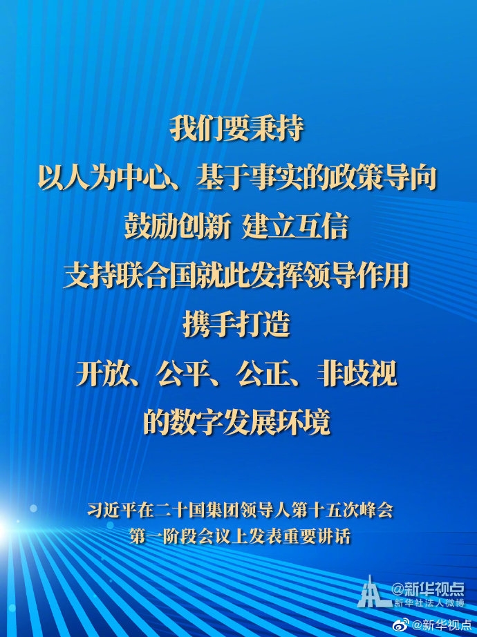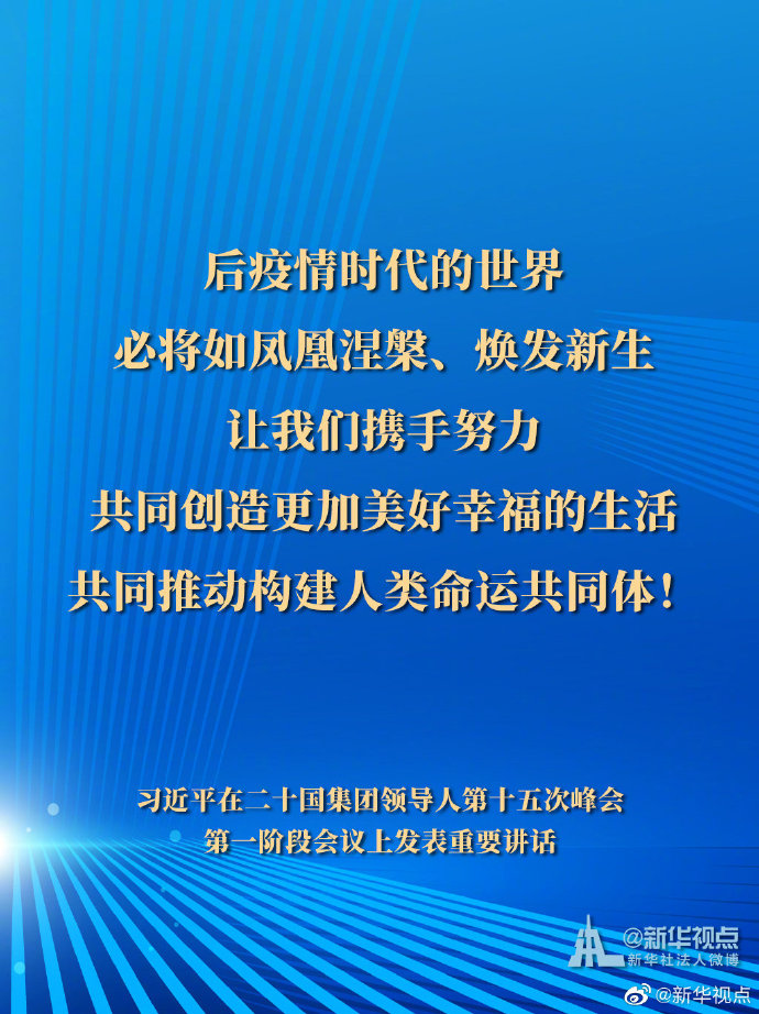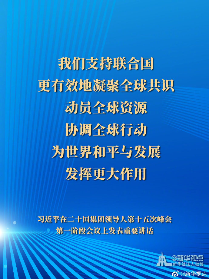 11月21日,國(guó)家主席習(xí)近平在二十國(guó)集團(tuán)領(lǐng)導(dǎo)人第十五次峰會(huì)第一階段會(huì)議上發(fā)表重要講話。一起來(lái)看習(xí)主席的G20金句。