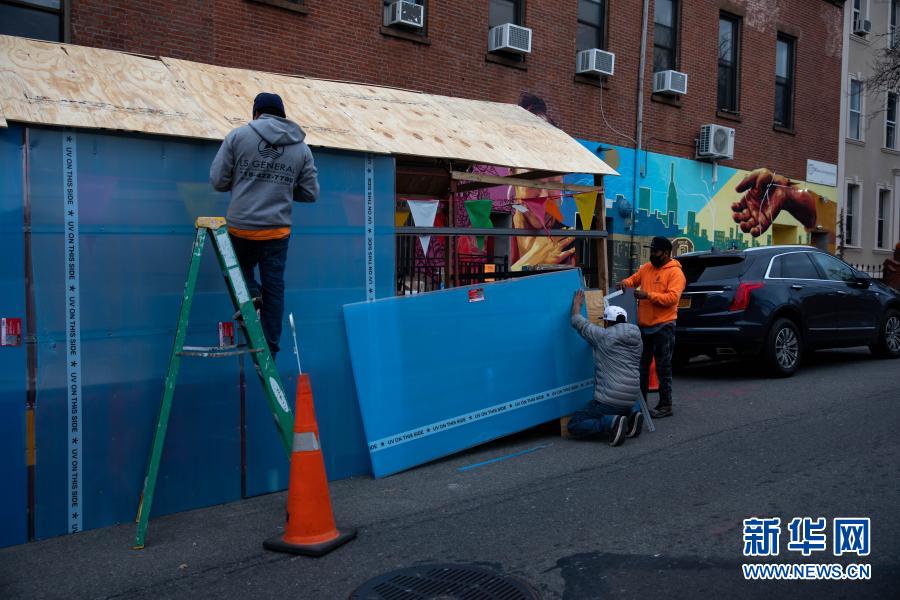 11月21日,在美國紐約,工人為一處戶外就餐區(qū)安裝保暖材料。新華社發(fā)(郭克 攝)