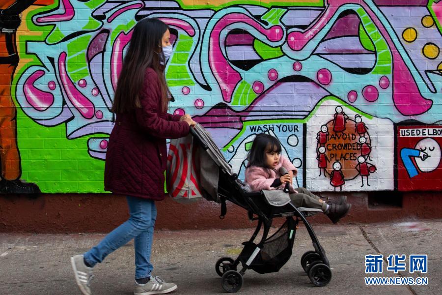 11月21日,在美國紐約,一名女子推著孩子經(jīng)過抗疫宣傳壁畫。新華社發(fā)(郭克 攝)