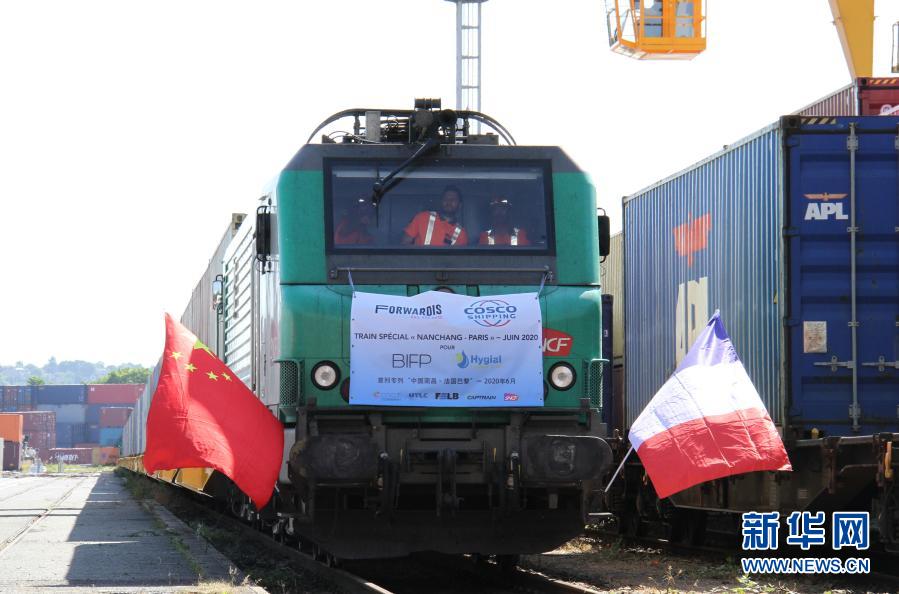 6月23日,滿載防疫物資的中歐班列抵達法國巴黎東南郊的瓦朗通,此次班列是中法首趟抗疫物資專列。新華社記者 徐永春 攝?