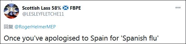 另一名網(wǎng)友接茬說(shuō):“只要你為‘西班牙流感’向西班牙道歉?!焙諣柲苍栌谩拔靼嘌懒鞲小保瑸椤爸袊?guó)流感”的說(shuō)法狡辯。