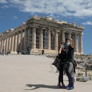 3月22日,游客在希臘雅典衛(wèi)城自拍。希臘露天考古遺跡22日起恢復開放。游客需遵守保持社交距離和佩戴口罩等防疫規(guī)定。新華社發(fā)(萊夫特里斯·帕察里斯攝)