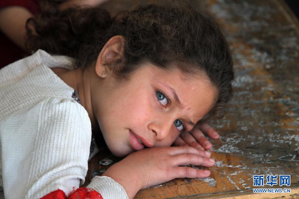 5月19日,受空襲影響而逃離家園的7歲巴勒斯坦兒童巴斯馬·阿布·拉薩斯在加沙城的一所學(xué)校臨時棲身。